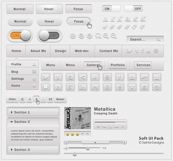 Soft UI Kit made by Kim Petersen. It contains many detailed UI elements such as buttons, menus, social buttons, sliders, a pagination style and an accordion, plus many more. The subtle gray shade allows a versatile usage in interface designs.